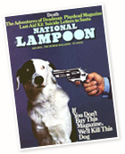National Lampoon was a wild humor magazine that began in 1970 as an offshoot of the Harvard Lampoon and was created by alumni from Harvard. The cover of a worried looking dog peering at a revolver pointing at its face became a notorious image and example of some of the wacky humor displayed.