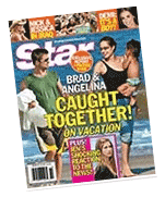 A glossy faked photo of Brad Pitt and Angelina Jolie on a beach together was the subject for Star's cover. Nowhere is it mentioned on the cover that the image was cobbled together. Pitt's pic came from a Caribbean beach, while Jolie's was snapped the previous year on a beach in Virginia. Star cops to the photo composite in small print on page 46.