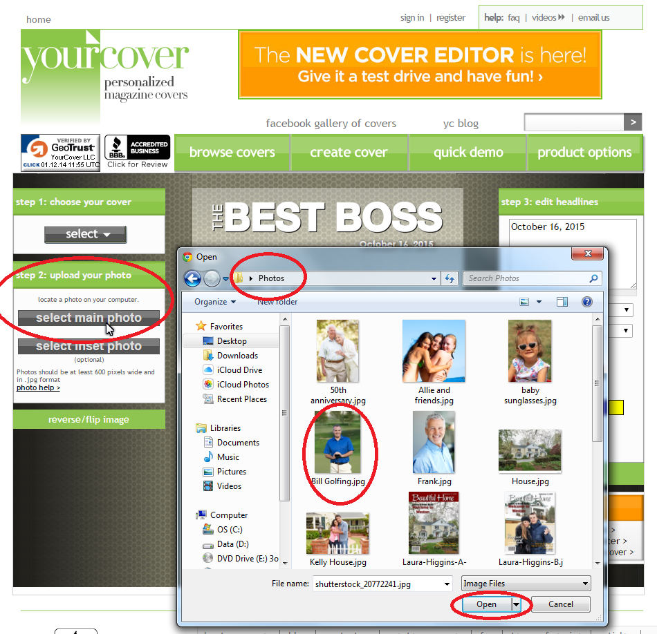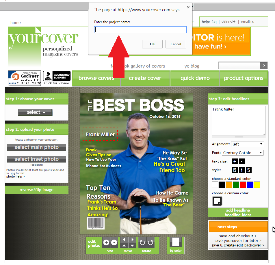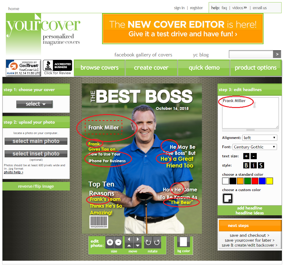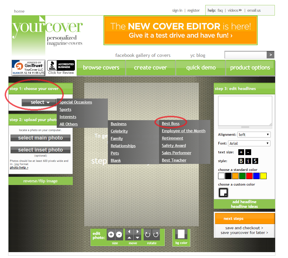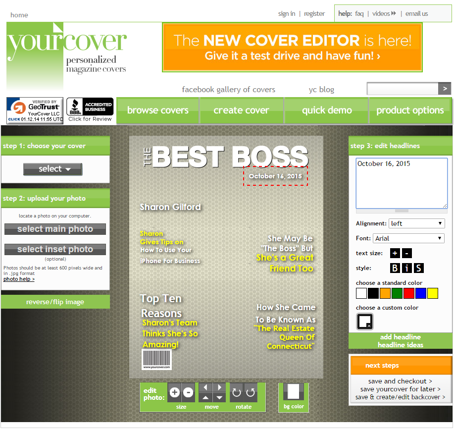 Boss’ Day 2015 is being celebrated on Friday October 16. Need a gift that’s special, but need it fast and inexpensively? Make a Best Boss personalized magazine cover at YourCover. This Bosses Day gift can be made in a manner of minutes and you can download the photo file for self-printing or YourCover can print (and optionally frame) the gift for you. If you decide to self-print, purchase the photo file download which will be delivered instantly on the order confirmation (thank you) page and also instantly emailed to you. After printing, just pop it into a frame and you’ll have a last minute gift that your boss will love! Follow these easy directions to create a unique, personalized Boss’ Day gift that will be the talk of the office! Go to YourCover.com and choose the Best Boss magazine cover template
