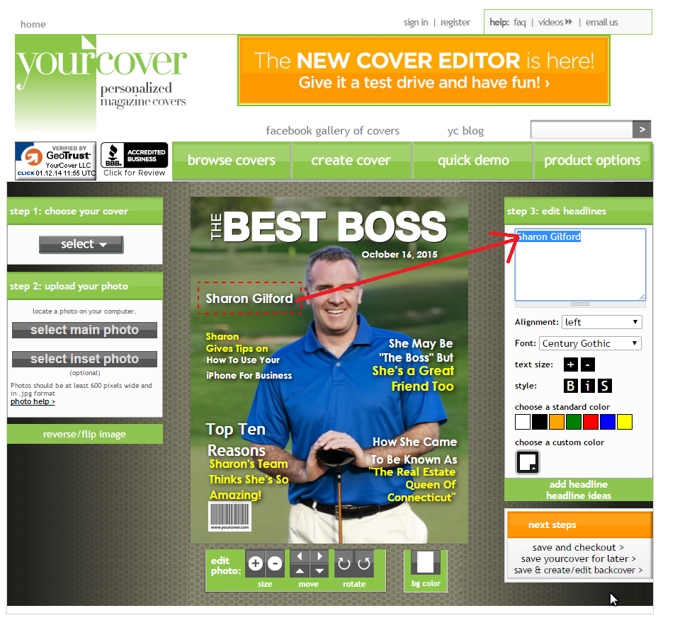 Click on each textbox (red dotted line will appear around it) and then change the text to be about your boss. The new text is typed into the box on the right. (You can also change the font style, size & color as well as drag the text box to a different location on the cover.)