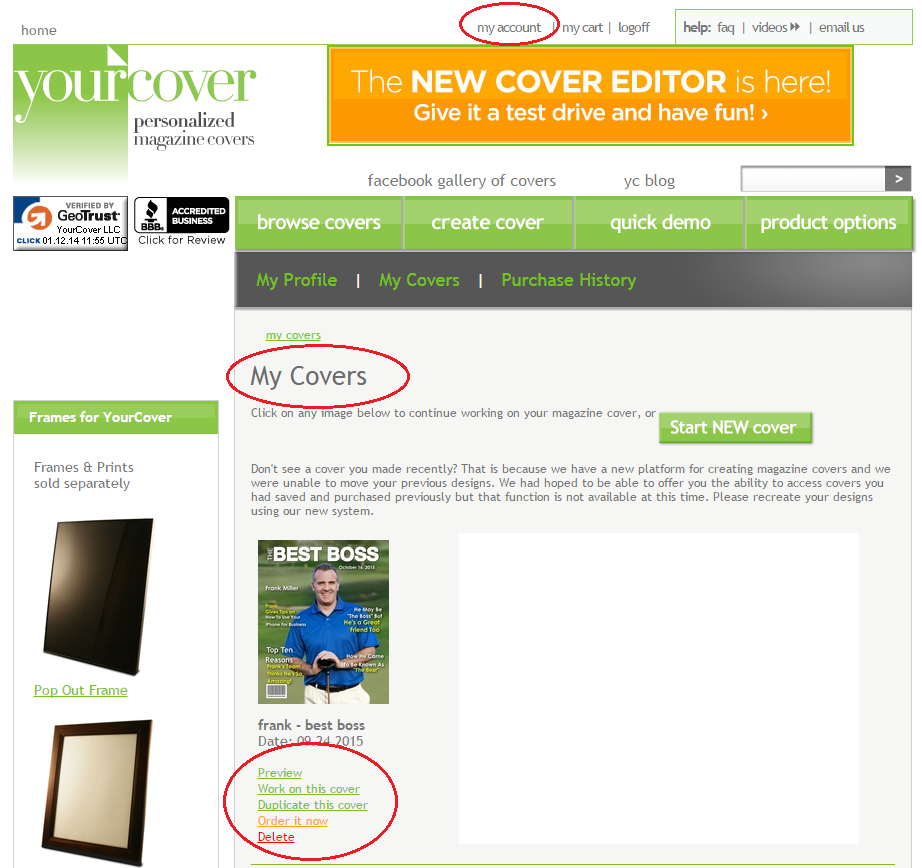 From the “My Covers” area of your account you will see a thumbnail image of your magazine cover, continue to edit it later or click “order it now” to purchase